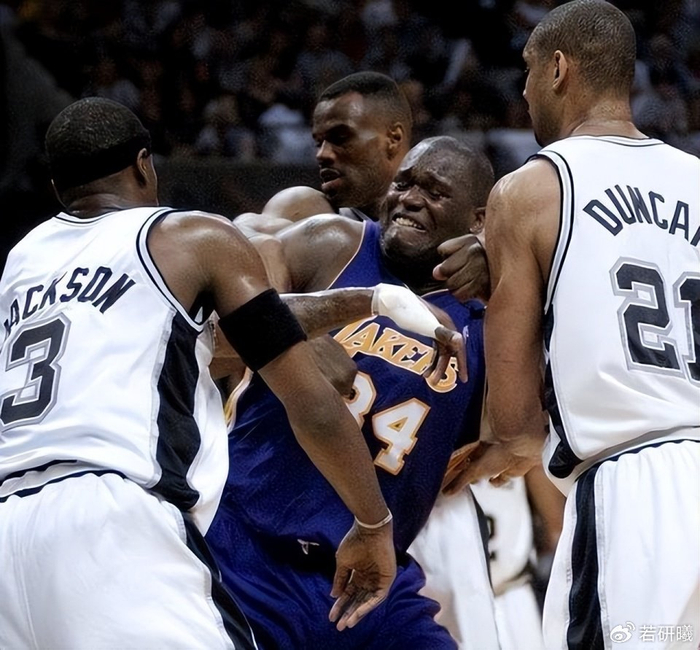 巅峰时期的奥尼尔,简直就是内线的一个无解BUG。他那300斤的体重加上2米16的身高,就像一座移动的小山,在内线翻江倒海。除了使用砍鲨战术,几乎没有任何人能真正限制住他。在奥尼尔率领湖人夺得三连冠的时期,马刺队多次成为他的手下败将。尽管马刺队拥有邓肯和海军上将这样的超级双塔组合,但在奥尼尔面前,他们也只能望洋兴叹。奥尼尔在内线的强大统治力,让马刺队的内线防守变得千疮百孔,波波维奇对此也是毫无办法。